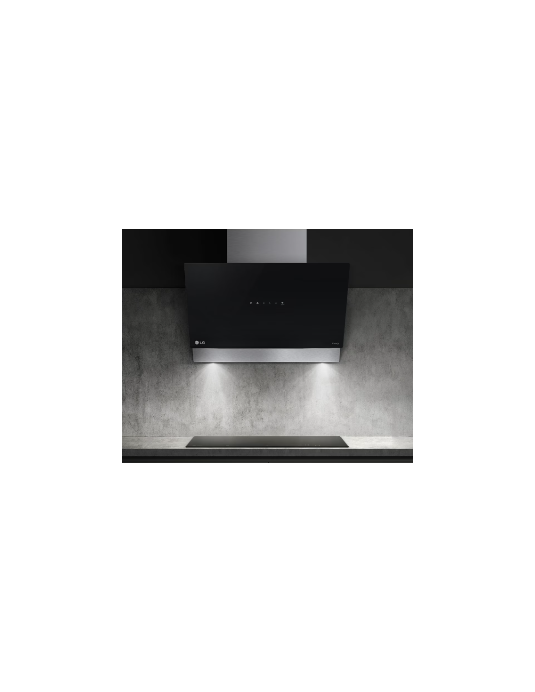 Campana decorativa Lg HCEZ2428B, inclinada, cristal negro-acero, 60cm, Clase energetica "C, Max. Ext. 800 M3, H, 3 niveles de potencia + Booster, Control Independiente Tactil, Display, Luz LED, Conectividad Wifi Conexión Placa – Campana, Filtros lavables en el lavavajillas