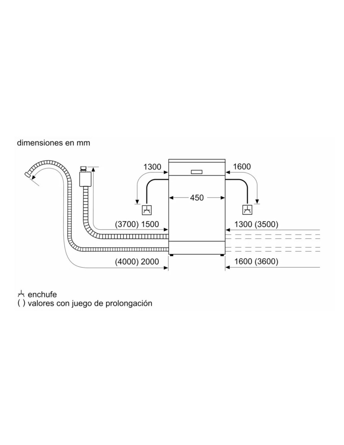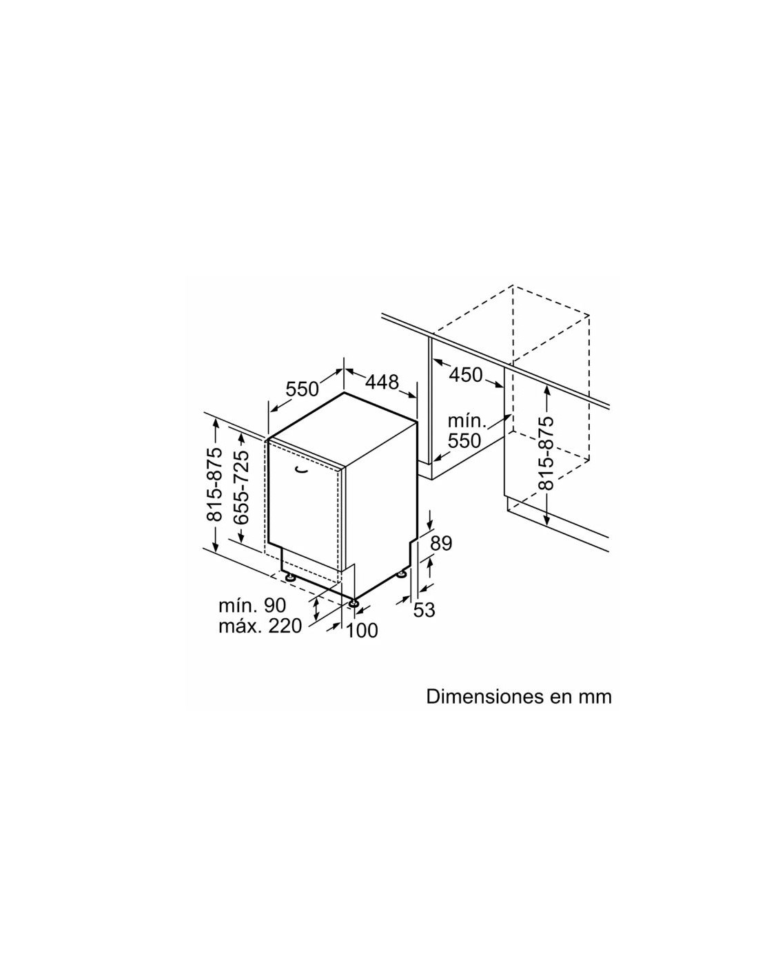 Siemens iQ300 SR63EX25KE. Tipo de instalación: Completamente integrado, Talla del producto: Estrecho (45 cm), Longitud del cable: 1,75 m. Número de cubiertos: 10 cubiertos, Clase de emisión de ruido: B, Nivel de ruido: 44 dB. Ajuste de patas: 6 cm. Clase de eficiencia de energía: B, Consumo de agua por ciclo de lavado: 8,7 L, Consumo de energía por 100 ciclos: 51 kWh. Ancho: 448 mm, Profundidad: 550 mm, Altura: 815 mm