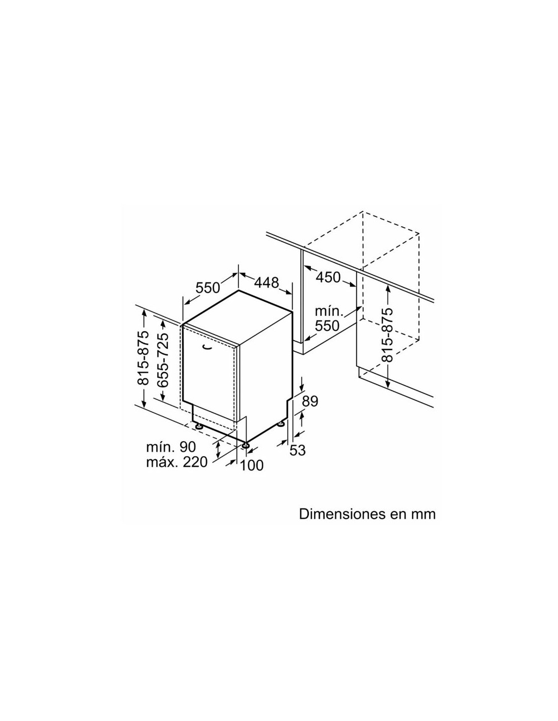 Siemens iQ500 SR65EX09ME. Tipo de instalación: Completamente integrado, Talla del producto: Estrecho (45 cm), Longitud del cable: 1,75 m. Número de cubiertos: 10 cubiertos, Clase de emisión de ruido: B, Nivel de ruido: 44 dB. Ajuste de patas: 6 cm. Clase de eficiencia de energía: B, Consumo de agua por ciclo de lavado: 8,7 L, Consumo de energía por 100 ciclos: 51 kWh. Ancho: 448 mm, Profundidad: 550 mm, Altura: 815 mm