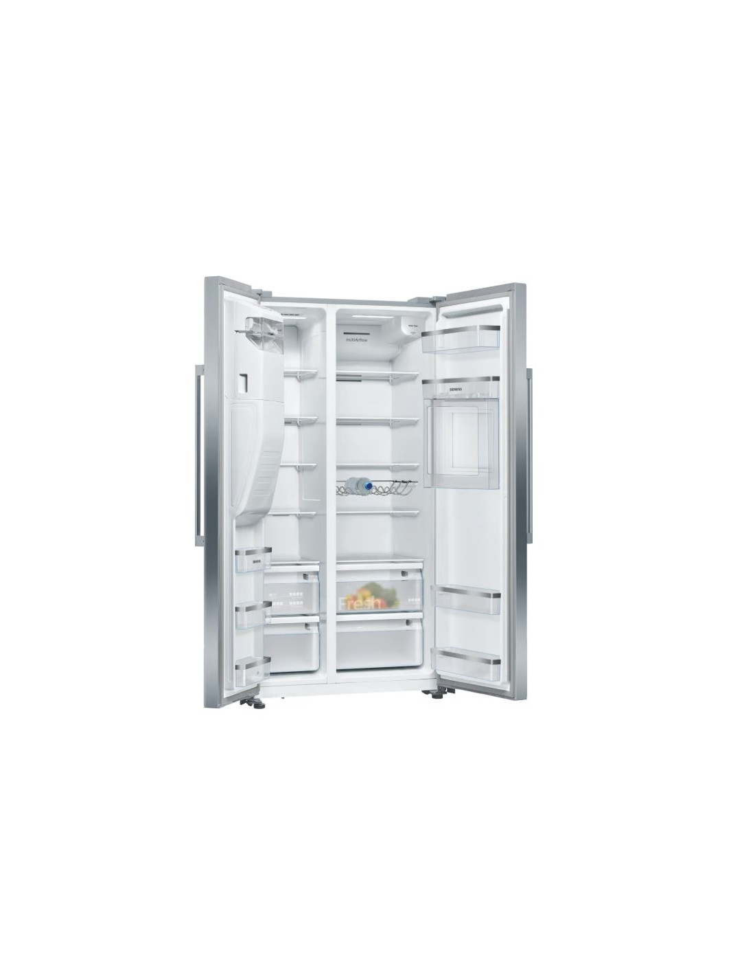 Frigo side by side Siemens KA93GAIDP, Frigorífico americano NoFrost, Clase energetica "D, Libre instalación, 179x91x71cm., 560 l., Puertas Acero antihuellas, HOME BAR. Fresh. Dispensador de agua y hielo.