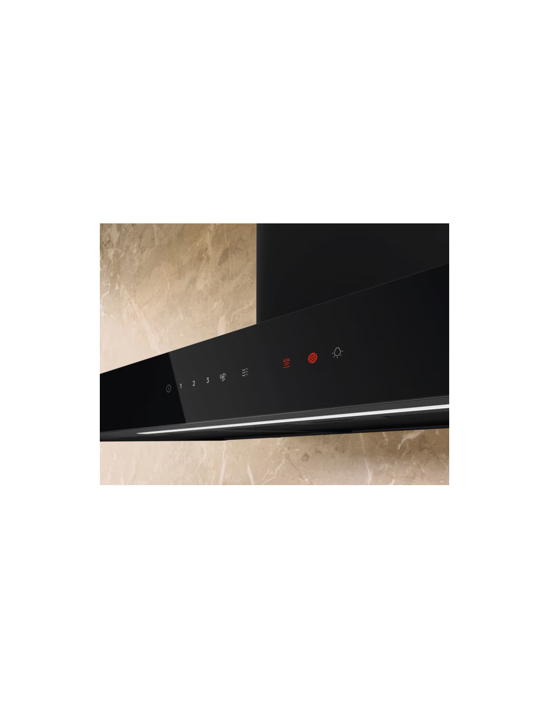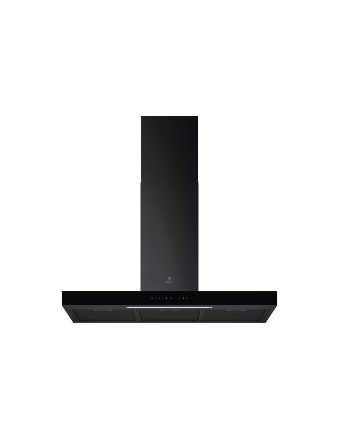 Campana decorativa Electrolux LFT819K, Serie 700 Breeze, Beta Glass 2.0, Negro/panel cristal negro, 90cm, A, 56/70/74dB ruido velocidades min/max/intens., Velocidades 3+Intensiva; Función Brisa, min-max 295-600 intensiva 730 m³/h, Controlo táctil en el cristal (blanco y rojo), Tira de LED (3000K), Hob2Hood, Brisa