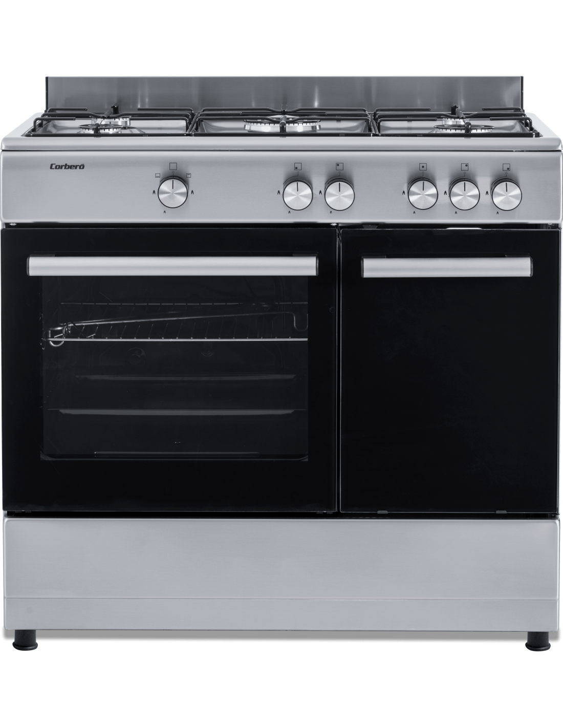 Cocina conv. Corbero CC510GB90X, 60L, Gas Butano, Color Inox, 5 Fuegos, Wok Fuego Medio, Porta bombona, Cajón Calientaplatos, Tapa Splashback (embellecedor metalico), Puerta Horno Doble Cristal, Bandeja Y Parrilla Cromada