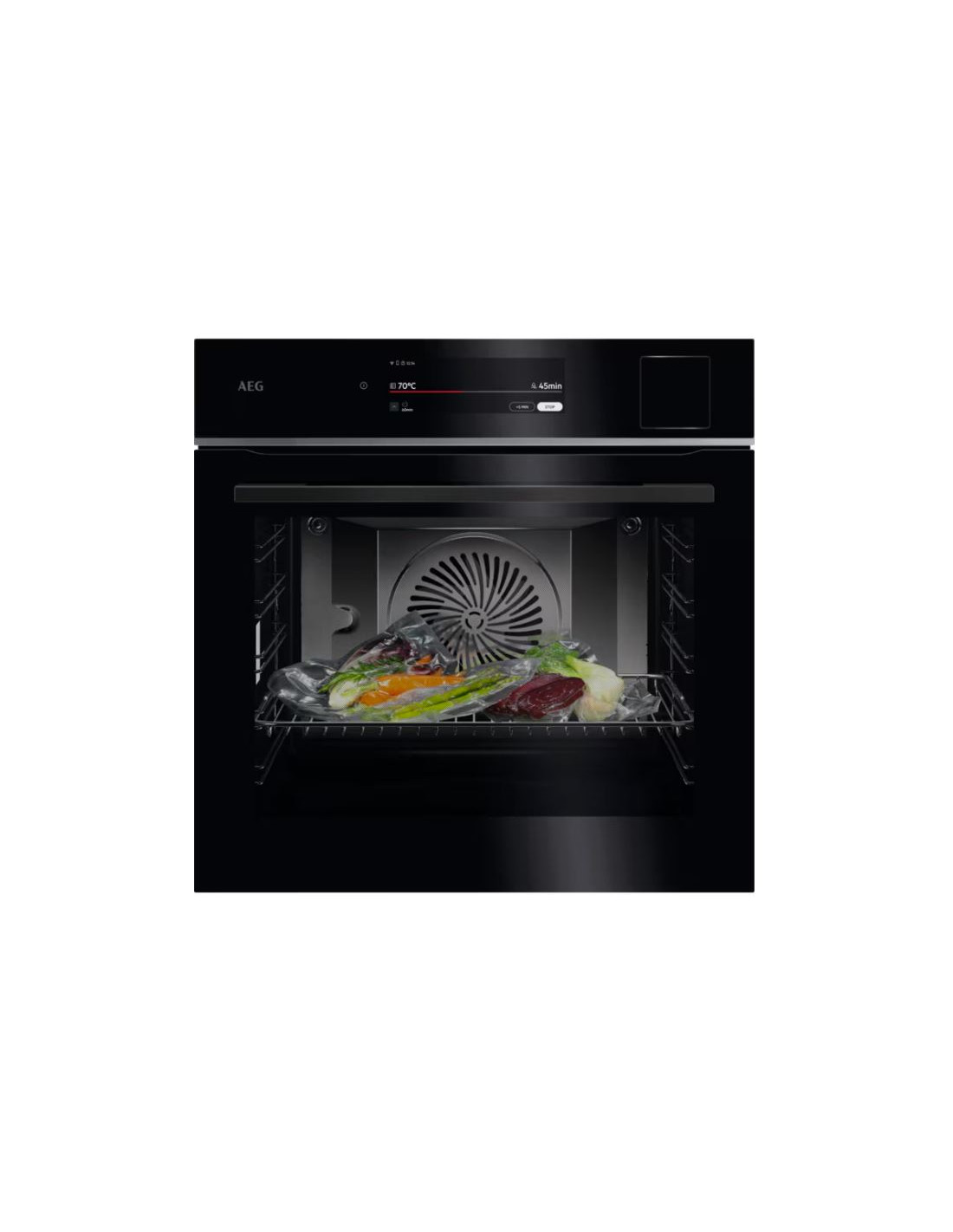 Horno MF indep. Aeg TP9SB831AB,Serie 9000 ProAssist SteamPro, 70L., 60cm, Limpieza Vapor, 27 Prog + 168 Auto prog, Display táctil CookSmart Touch+ (7.8") con Wifi, Carril 1 nível, Apertura/Cierre Suave, Sonda T., 4 cristales, A++, Cristal Negro con perfil Inox Infinity y tirador Negro anodizado