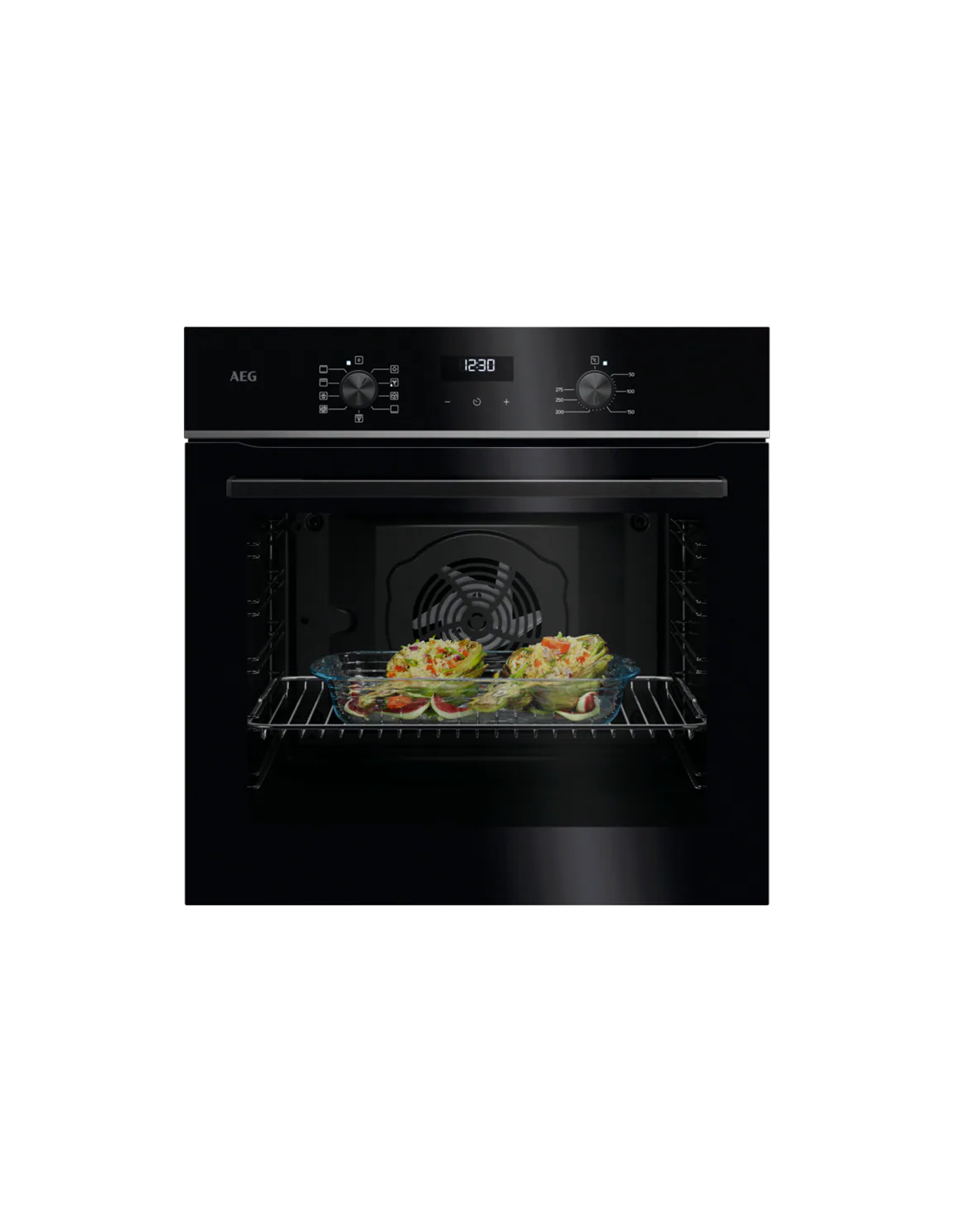Horno MF indep. Aeg TU5AB21FSB, Serie 5000 SurroundCook, 72L., 60cm, Cristal Negro con perfil Inox Infinity y tirador Negro anodizado, A+, Aqua Clean, 9 Prog, Display LED, mandos escamoteables, Carril 1 nível