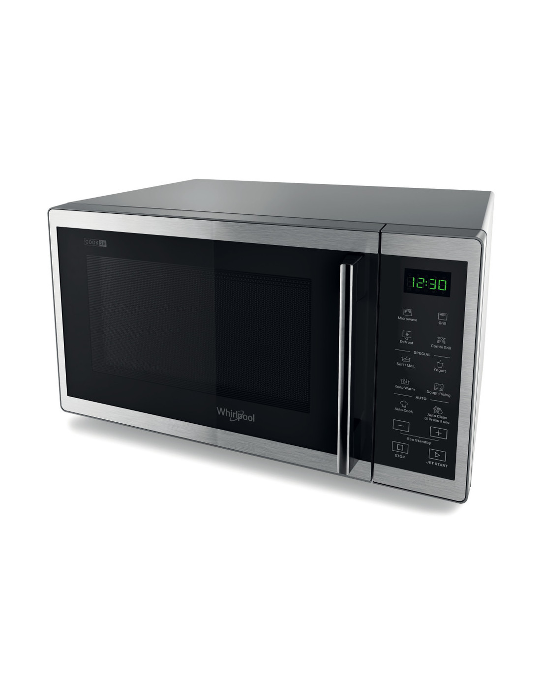Microondas Whirlpool MWP253SX, 25 L, COOK 25, MWO/GRILL - 900/1000W, INOX, AUTOCOOK, Plato 27 cm, Micro +Grill, Display: LED, 7 niveles de potencia, Sistema de distribuición de olas 2D, Apertura Lateral, Grill de Cuarzo, Jet Start, Mantener Caliente, Temporizador, Bloqueo de seguridad, Potencia Total (W): 1400, Potencia Grill (W): 1000, Cavidad Pintada, 281 x 483 x 419 mm
