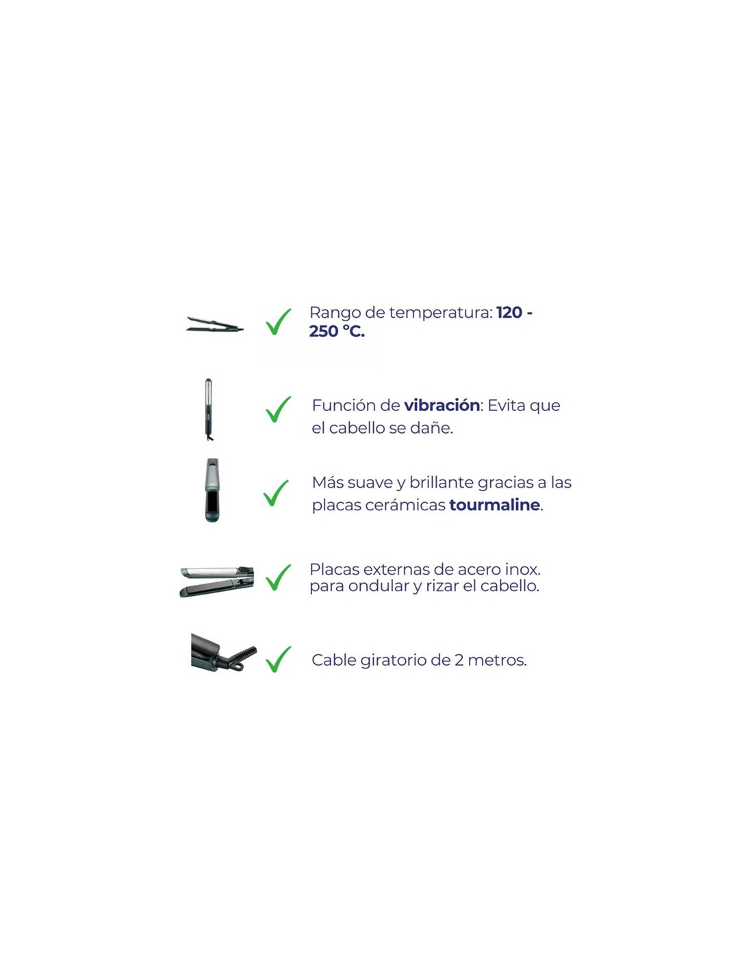 PLANCHA PELO JATA JBPP1503, Rápido alcance de la temperatura. Peinado más liso y sin encrespamiento gracias a su generador de iones. Función de vibración: Evita que el cabello se dañe durante el proceso de alisado. Pelo más suave y brillante gracias a las placas cerámicas tourmaline. Placas externas de acero inoxidable diseñadas para ondular y rizar el cabello. Rango de temperatura: 120 - 250 ºC. Interruptor de encendido. Bloqueo del cierre de placas. Desconexión automática. Cable giratorio de 2 metros. Anilla para colgar. Multicorriente 110-240 V Potencia 52 W.