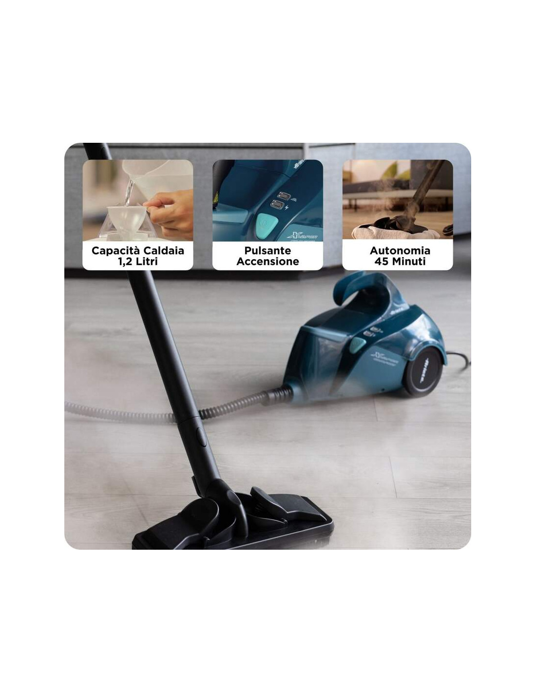 LIMPIADORA DE VAPOR COMFORT ARIETE 414522, Potencia: 1500 W. - Presión máxima: 5 BAR. - Depósito de agua: 1.2 L (útiles). - Regulador del vapor. - Tapón y pistola de seguridad. - Tiempo de calentamiento 5-6 min. - Indicador luminoso on/off. - Indicador luminoso listo para usar. - Compartimento para guardar los accesorios. - Incluye 10 accesorios de limpieza: boquilla 90º, boquilla, cepillo para ventanas, cepillo grande redondo, cepillo pequeño redondo, embudo, taza medidora, cepillo tapicerías + funda, tubo extensible y funda para el cepillo del suelo. - Autonomía de 45 min. - Cable de 6 m. - Color azul.