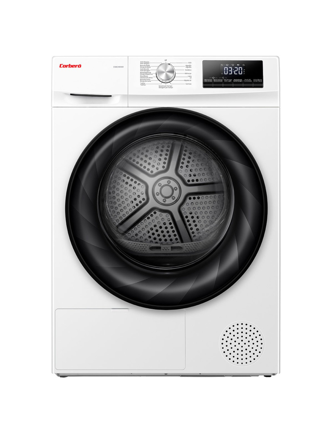 Secadora Carga Frontal Corbero CSBCH830W, 8kg, Bomba de Calor, DisplayLED, Color Blanco, 15 Programas, Programa Inicio Diferido, Función Inicio/Pausa, Antiarrugas y Intensidad,LuzLED, 64dB, Etiqueta energética "D