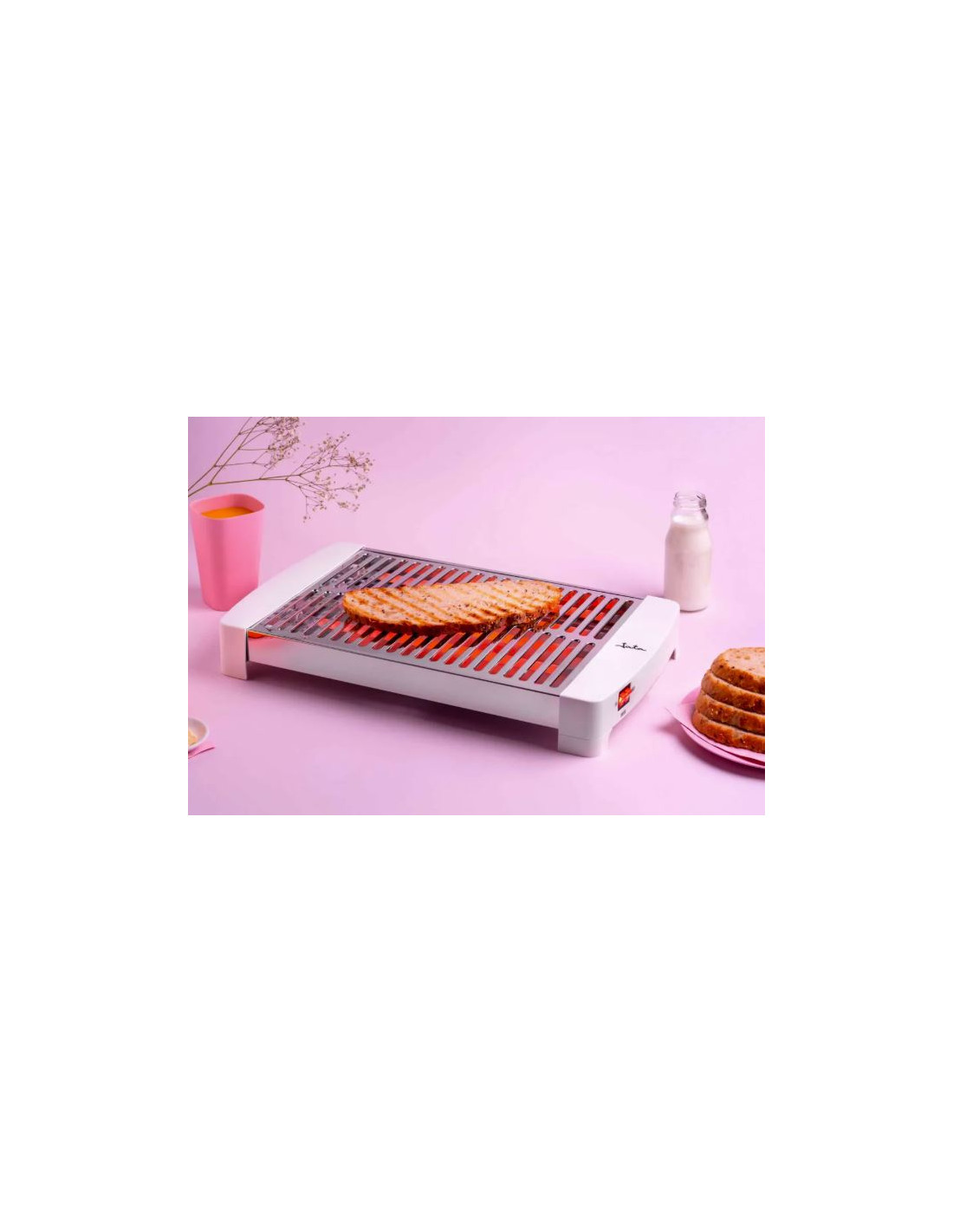 Tostador JATA TT5016 HORIZONTAL BLANCA Gran superficie de tostado. Medidas 35 x 25 cm. Tostado homogéneo por 5 barras de cuarzo.Mueble y parrilla en acero inoxidable.2 interruptores. 3 potencias de calor 400 W – 600 W – 1.000 W. Bandeja recogemigas extraíble.Aroma y sabor del pan recién sacado del horno.Voltaje 230 V.Potencia 1.000 W.