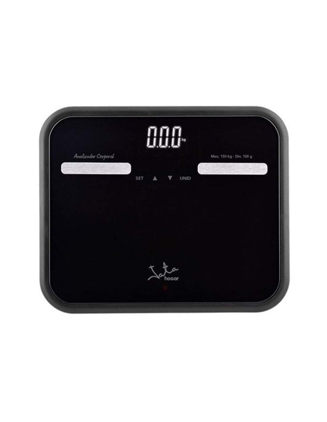 Bascula Baño Jata 538 ANALIZADOR CORPORAL 7 FUNCIONES BAMBÚ 180 KG Capacidad 180 kg. Graduación 100 g. Analiza: Masa muscular. Agua corporal. Grasa corporal. Densidad ósea. Índice de masa corporal. Informa: Calorías diarias recomendadas. Peso. Memoria para 10 personas. Superficie de bambú de 12 mm. Mandos táctiles. Visor “LCD” auto luminiscente. Desconexión automática. Función de conversión de kg / lb / st. Indicador de batería baja y sobrepeso. Funciona con 2 pilas “AAA” de 1,5 V (no incluidas).