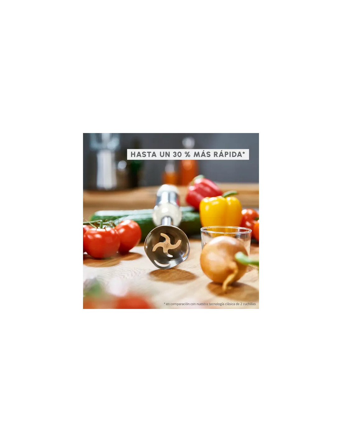 Rendimiento excepcional y resultados de batido impecables y rápidos: ¡Quickchef de Moulinex te facilita la vida! Las 4 cuchillas con avanzada tecnología Powelix ofrecen un rendimiento un 30% más rápido que nuestros modelos de doble cuchilla, poniendo al alcance de tu mano unos resultados increíblemente suaves y cremosos. Los 1000 W de potencia garantizan un rendimiento rápido y uniforme, y con 10 velocidades ajustables en un cómodo brazo antideslizante que te permiten obtener la textura deseada. Los versátiles accesorios para picar y montar completan sus prestaciones, para una inspiración sin fin y multitud de recetas.