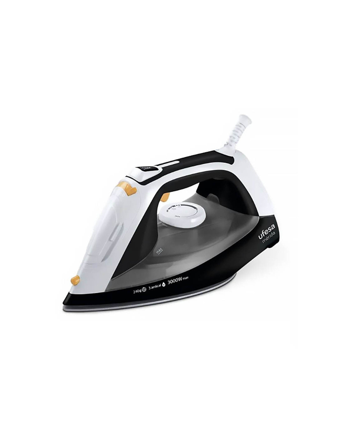 Plancha ropa Ufesa PV3650 Merida, Potencia 3000W Golpe de vapor: 240gr Vapor constante: 45gr / min Dosificación de vapor variable Sistema Calc’n Clean Sistema antical 3 en 1 (1-Sistema de autolimpieza, 2-Golpe antical, 3- Cartucho antical) Capacidad del depósito: 400ml Sistema antigoteo Planchado vertical Planchado con vapor o en seco Función de pulverización Suela cerámica Talón diseñado para guardar el cable fácilmente