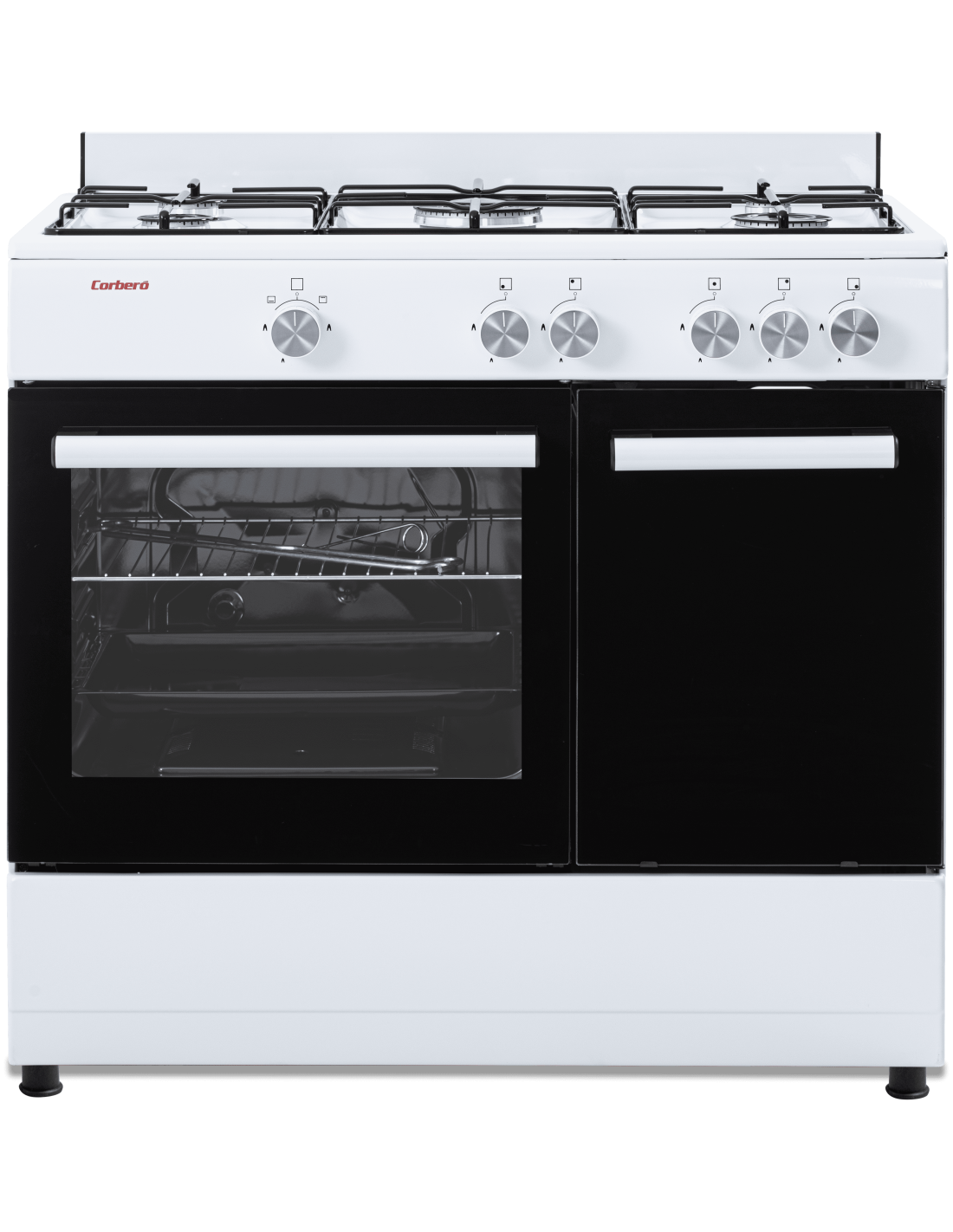 Cocina conv. Corbero CC510GB90W, 60L, Gas Butano, Color Blanco, 5 Fuegos, Wok a la Izquierda, Porta bombona, Cajón Calientaplatos, Tapa Fogones de Cristal, Puerta Horno Doble Cristal, Bandeja y Parrillas Extra Thick Mate