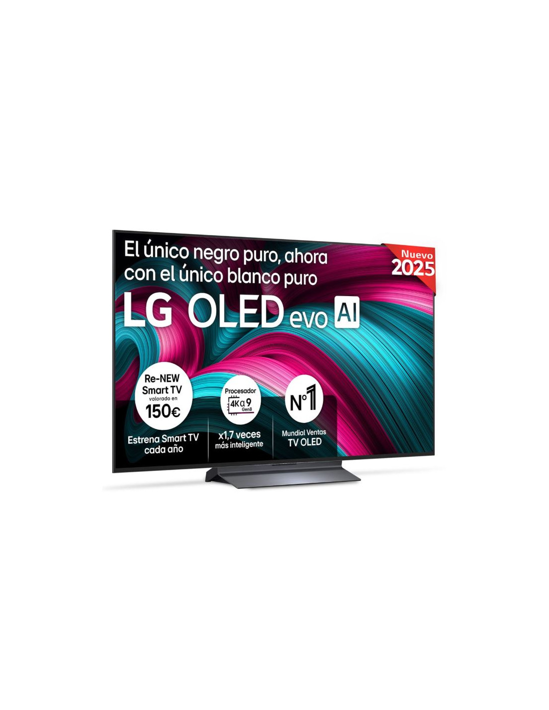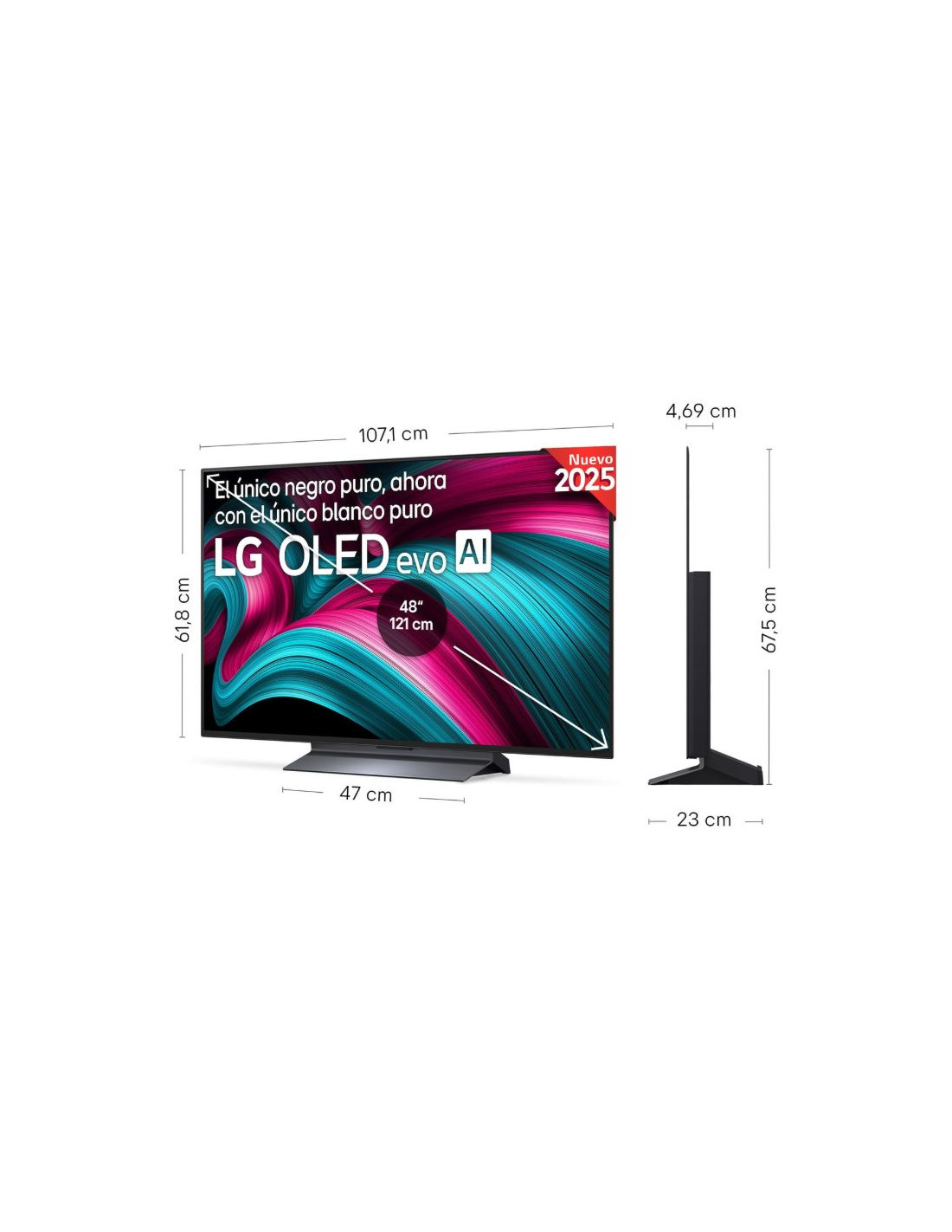 LG OLED evo AI OLED48C54LA.AEU. Diagonal de la pantalla: 121,9 cm (48"), Resolución de la pantalla: 3840 x 2160 Pixeles, Tipo HD: 4K Ultra HD, Tecnología de visualización: OLED evo, Forma de la pantalla: Plana. Smart TV. Tecnología de interpolación de movimiento: Movimiento OLED, Tiempo de respuesta: 0,1 ms, Relación de aspecto nativa: 16:9. Formato de señal digital: DVB-C, DVB-S, DVB-S2, DVB-T, DVB-T2. Wifi, Ethernet. Color del producto: Negro