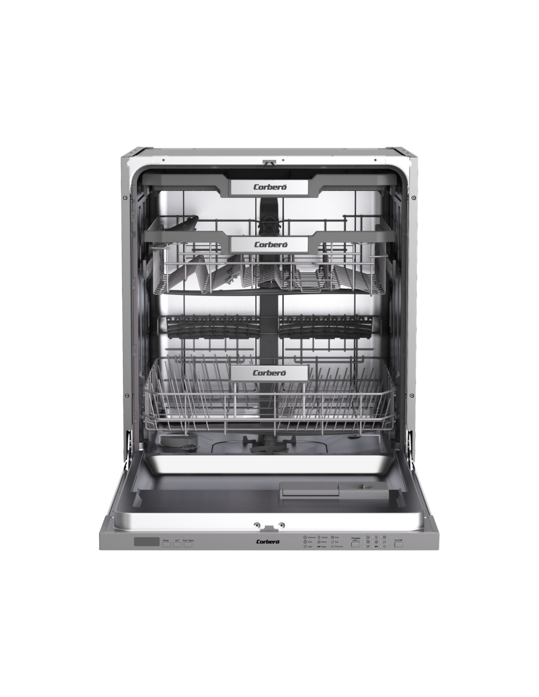 Lavavajillas 60 INT Corbero CLVG9726I, integrable, 15 cubiertos, 7 Programas, 5 Temperaturas, Función Auto Apertura, Display Led, Motor Inverter, 3era Bandeja, Cesta Superior Regulable En Altura con Carga, Inicio Diferido, Función Zona Dual, 42 Db, Eficiencia Energética "C