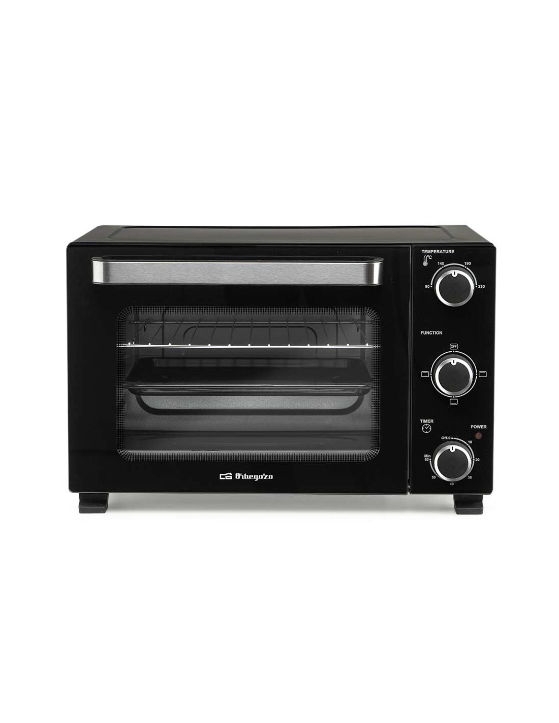 Mini Horno Orbegozo HO282, 28 litros. Potencia: 1500w. Temperatura regulable de 90 c 230 c. Piloto luminoso de funcionamiento. Luz interior para controlar la cocción. Temporizador de 60 min con señal acústica de parada. Calor superior e inferior, simultáneo o individual. Puerta abatible con doble cristal para mantener el calor. Resistencias de acero inoxidable. Bandeja recogemigas. Accesorios: bandeja, parrilla y mango para bandeja/parrilla. Medidas (ancho-alto-fondo): 48,5x31x39,5 cm. Conexión 220 - 240v ~ 50/60hz.