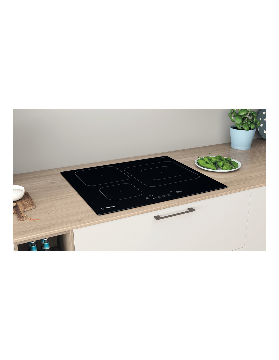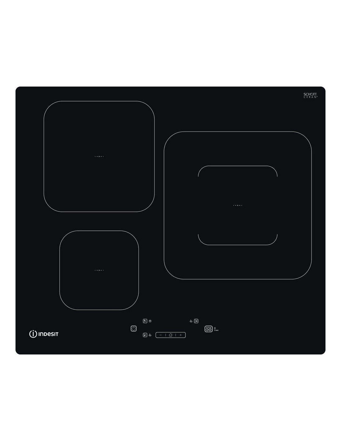 Vitroceramica induccion indep. Indesit IS55Q60NE, Display Táctil (Botones), 3 zonas de cocción, 9 niveles de potencia + booster, Potencia Total (kW): 7.2, Funciones automáticas Push&Go: Push&Boil, Push&Warm y Push&Moka, con un solo clic, Bloqueo de seguridad, Dimensión de Fuegos (mm): 1 x 145, 2 x 280, Color: Negro, Acabado: Sin Marco, Instalación Slim, Dimensiones: 54 x 590 x 510 mm, Dimensiones Empaquetado: 120 x 670 x 600 mm