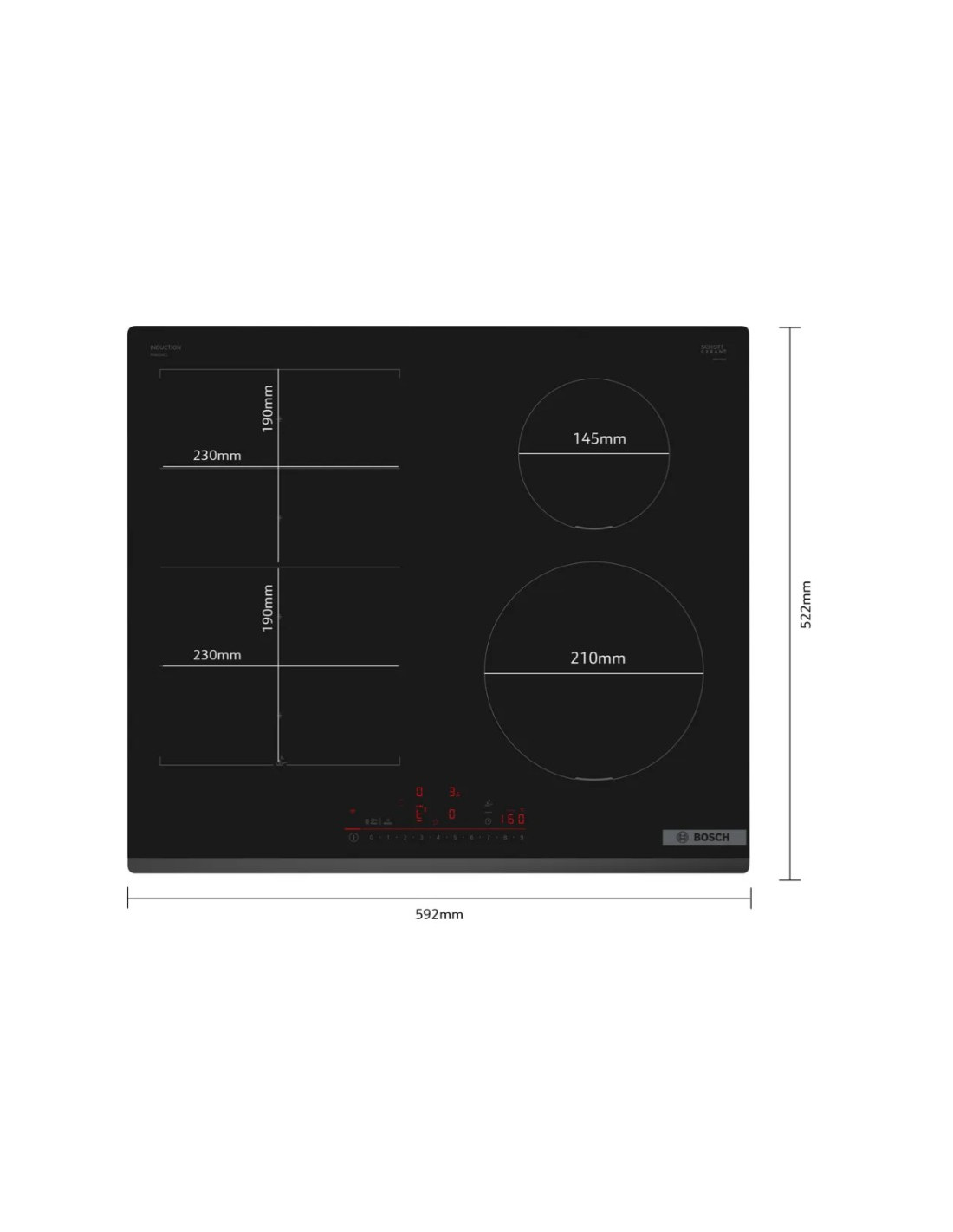 Bosch Serie 6 PIX631HC1E. Color del producto: Negro, Tipo de instalación: Integrado, Anchura de los quemadores: 60 cm. Tipo de control: Tocar, Control de posición: Frente, Tipo de temporizador: Digital. Carga conectada (eléctrica): 7400 W, Voltaje de entrada AC: 220 - 240 V, Frecuencia de entrada AC: 50 - 60 Hz. Ancho: 592 mm, Profundidad: 522 mm, Altura: 51 mm. Ancho del paquete: 753 mm, Profundidad del paquete: 608 mm, Altura del paquete: 126 mm