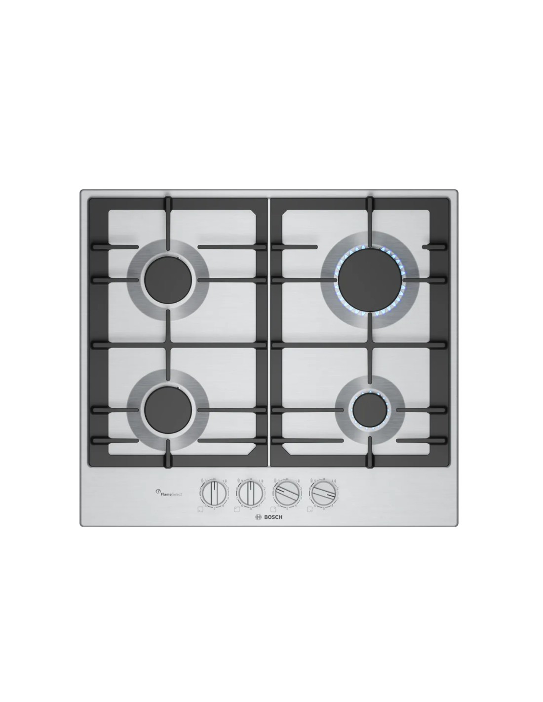 Encimera gas indep. Bosch PCP6A5I90, Gas, Encastrable, 60cm., 4 quemadores, Acero, FlameSelect, gasStop, parrillas hierro fundido aptas lavavajillas, autoencendido.