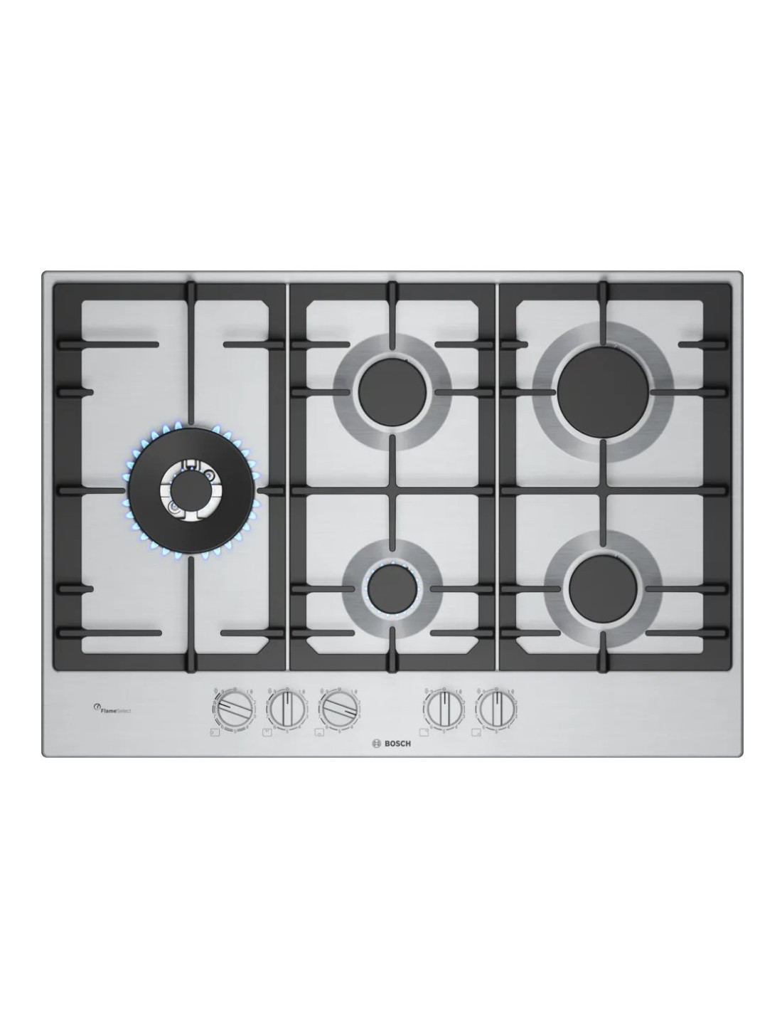 Encimera gas indep. Bosch PCS7A5I90, Gas, Encastrable, 75cm., 5 quemadores, Acero, FlameSelect, wok 5Kw., gasStop, parrillas hierro fundido aptas lavavajillas, autoencendido.