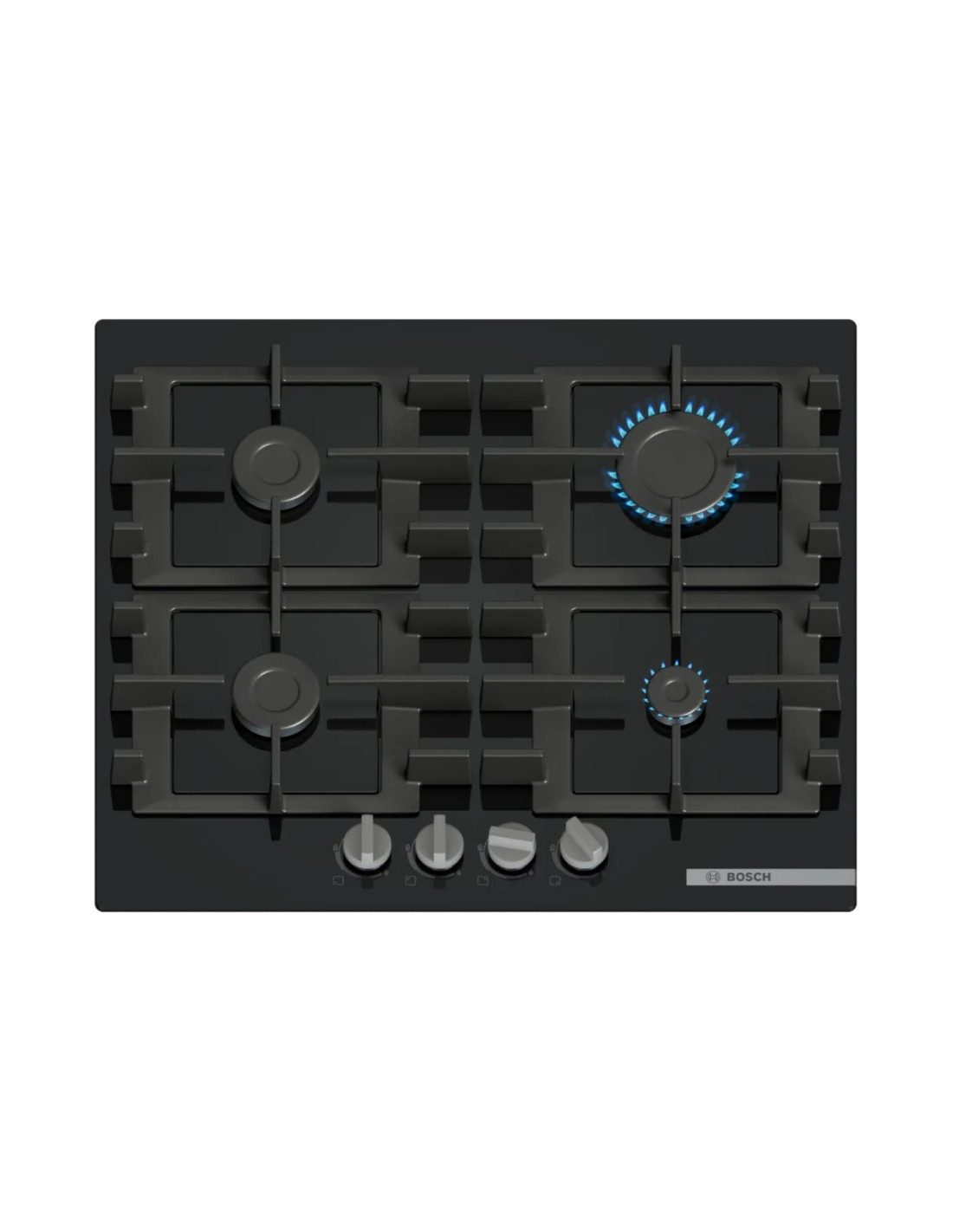 Encimera gas indep. Bosch PNP6B6K40, Gas, Encastrable, 60cm., 4 quemadores, Cristal templado negro, gasStop, parrillas hierro fundido aptas lavavajillas, autoencendido.