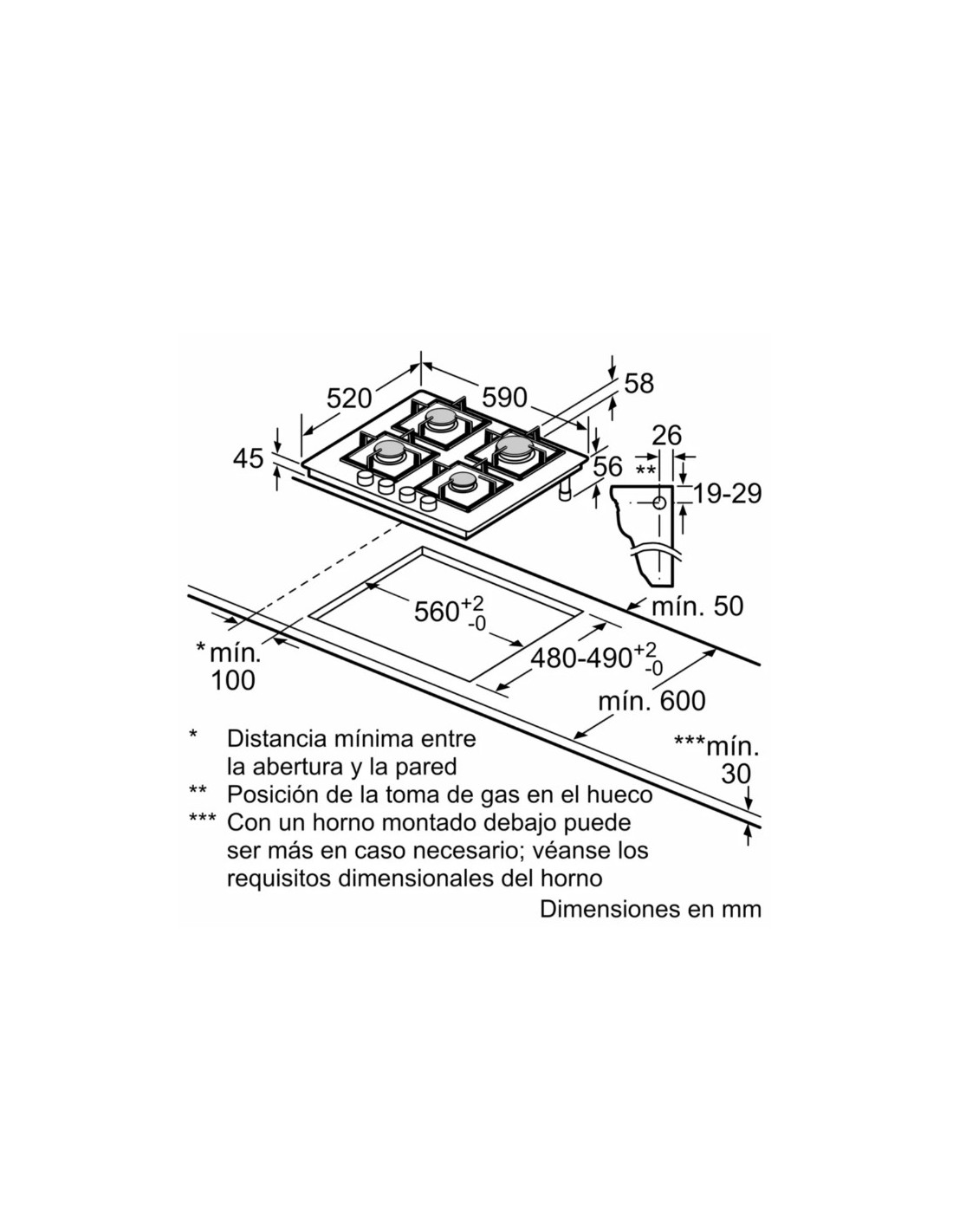 Bosch Serie 4 PNP6B6K40. Color del producto: Negro, Tipo de instalación: Integrado, Anchura de los quemadores: 59 cm. Tipo de control: Giratorio, Control de posición: Frente, Tipo de encendido electrónico: Encendido con una mano. Carga conectada (gas): 7500 W, Voltaje de entrada AC: 220-240 V, Frecuencia de entrada AC: 50/60 Hz. Ancho: 590 mm, Profundidad: 520 mm, Altura: 57,4 mm. Ancho del paquete: 651 mm, Profundidad del paquete: 578 mm, Altura del paquete: 141 mm