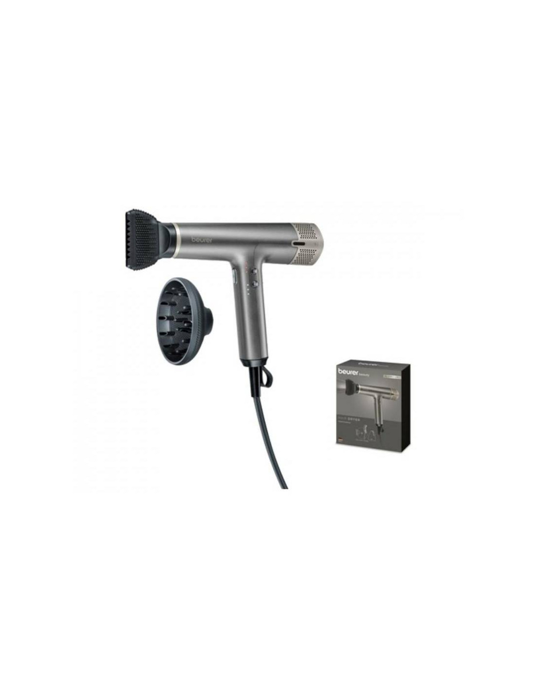 Secador de pelo Beurer HC2R glamour, 1700W, funcion iones integrada, peine incluido, concentrador prof. acoplamiento extrecho y magnético, difusor columen magnético y acoplable, posición aire frío, 3 temperaturas + 3 velocidades y aire frío, cable flexible con 2.80 metros, carcasa ultraligera (360 gr).