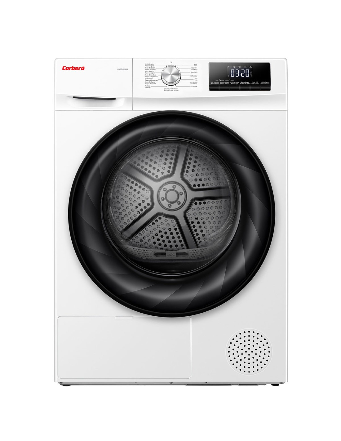 Secadora Carga Frontal Corbero CSBCH930W, 9kg, Bomba de Calor, DisplayLED, Color Blanco, 15 Programas, Programa Inicio Diferido, Función Inicio/Pausa, Antiarrugas y Intensidad,LuzLED, 64dB, Accesorio estandaria para zapatos, Etiqueta energética "D