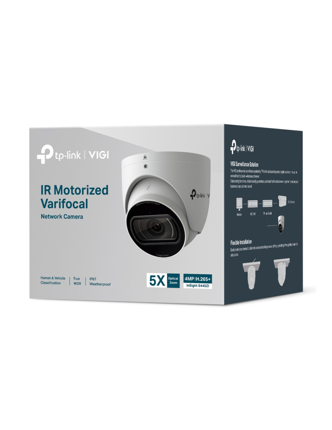 TP-Link VIGI InSight S445ZI. Tipo: Cámara de seguridad IP, Colocación soportada: Exterior, Tecnología de conectividad: Alámbrico. Tipo de montaje: Techo, Color del producto: Blanco, Factor de forma: Torreta. Ángulo de rotación: 360°, Ángulo de visión de la lente, horizontal: 29.6–102, Ángulo de visión de la lente, vertical: 16.8–53.8. Tipo de sensor: CMOS, Tamaño del sensor óptico: 25,4 / 2,9 mm (1 / 2.9"). Zoom óptico: 5x, Intervalo de longitud focal: 2.7 - 13.5 mm, Enfoque: Motorizado