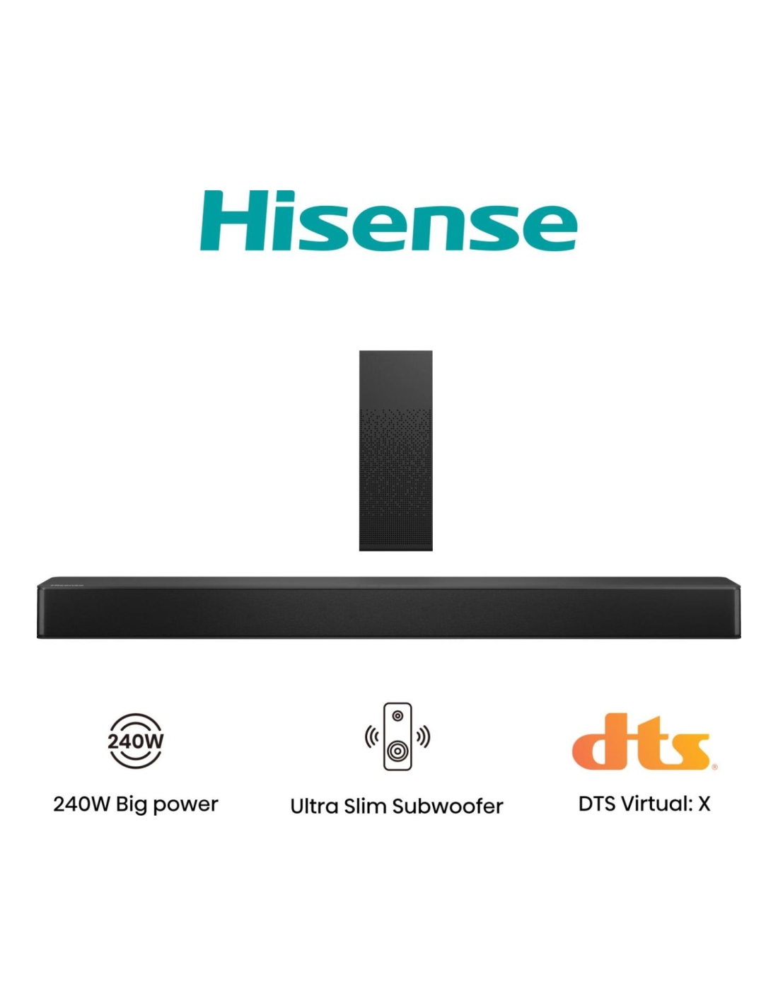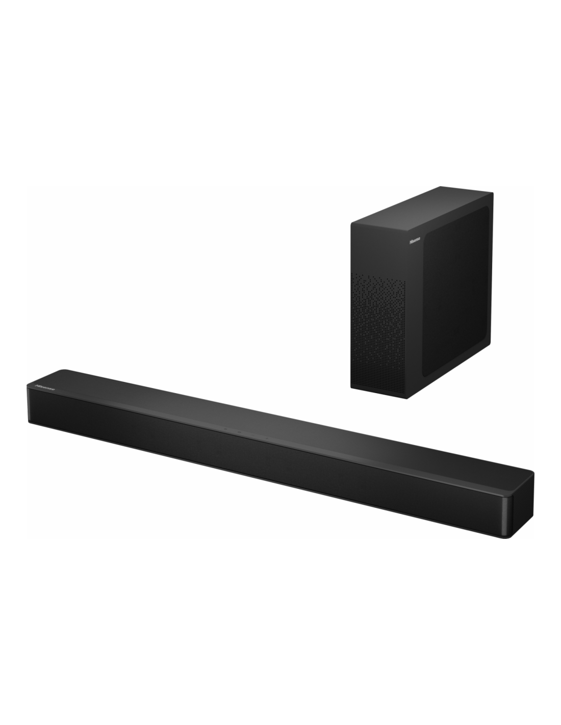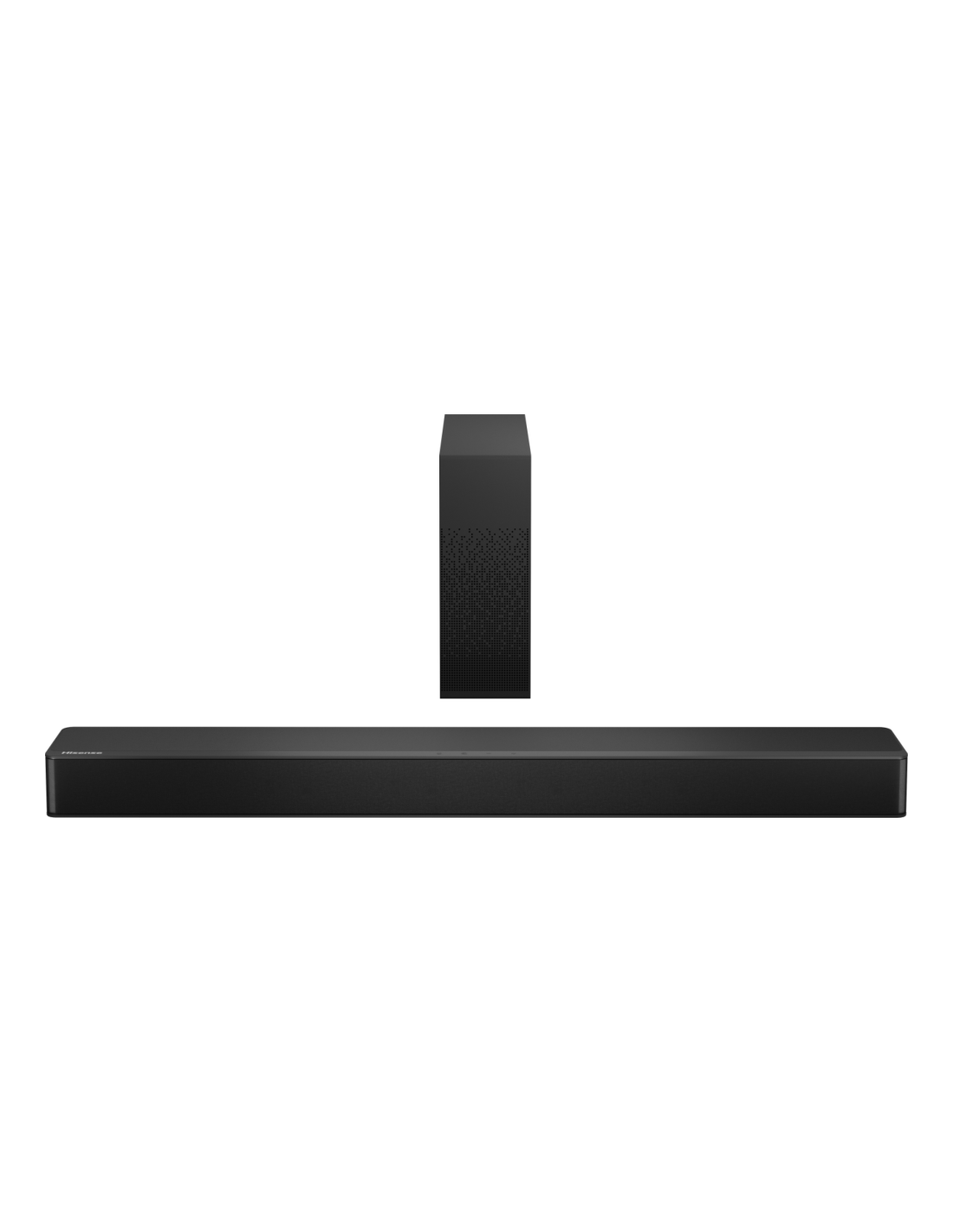 Hisense HS2100. Canales de salida de audio: 2.1 canales, Potencia estimada RMS: 240 W, Decodificadores incorporados: DTS Virtual:X, Dolby Digital, Dolby Digital Plus. Potencia de la barra de sonido del altavoz RMS: 120 W, Divisor de frecuencia: 20000 Hz, Diámetro del woofer (imperial): 13,3 cm (5.25"). Tipo de subwoofer: Altavoz de subgraves (subwoofer) activo, Conectividad del altavoz de subgraves (subwoofer): Inalámbrico, Potencia RMS de subwoofer: 120 W. Color del producto: Negro, Formatos de audio soportados: MP3, WAV, WMA, Control de volumen: Botones. Tecnología de conectividad: Inalámbrico y alámbrico