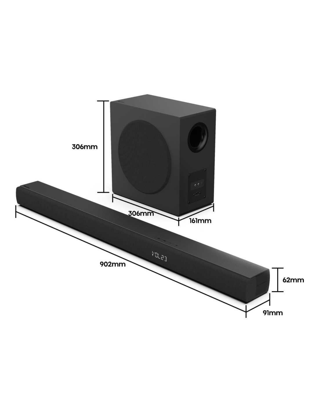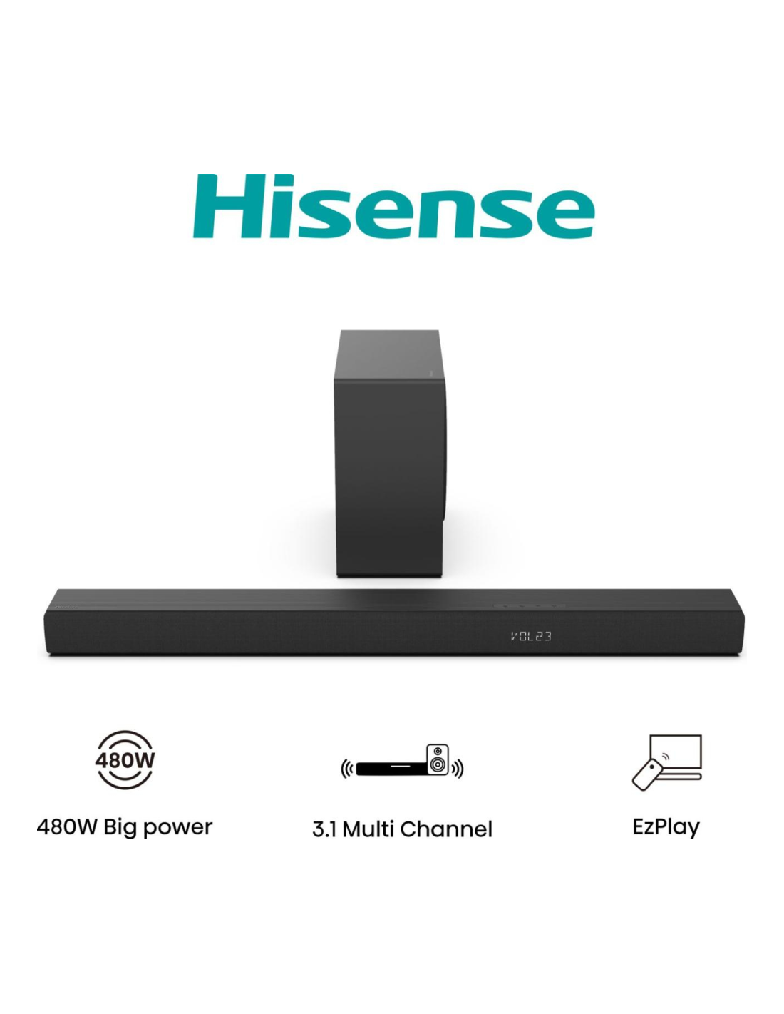 Hisense HS3100. Canales de salida de audio: 3.1 canales, Potencia estimada RMS: 480 W, Decodificadores incorporados: DTS Virtual:X, Dolby Digital. Potencia de la barra de sonido del altavoz RMS: 180 W. Tipo de subwoofer: Altavoz de subgraves (subwoofer) activo, Conectividad del altavoz de subgraves (subwoofer): Inalámbrico, Potencia RMS de subwoofer: 180 W. Color del producto: Negro. Tecnología de conectividad: Inalámbrico y alámbrico