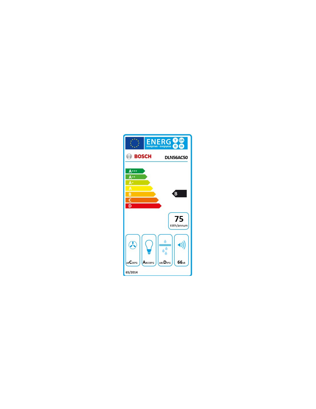 Bosch Serie 6 DLN56AC50. Máxima capacidad de extracción: 570 m³/h, Tipo de extracción: Canalizado/Recirculación, Clasificación eficiencia dinámica de fluidos: C. Tipo: Encastrada, Color del producto: Acero inoxidable, Tipo de control: Botones. Tipo de filtro de grasa: Aluminio. Potencia de bombilla: 2 W, Número de bombillas: 2 bombilla(s), Tipo de bombilla: LED. Clase de eficiencia de energía: B, Consumo de energía anual: 75 kWh, Escala de eficiencia energética: A+++ a D