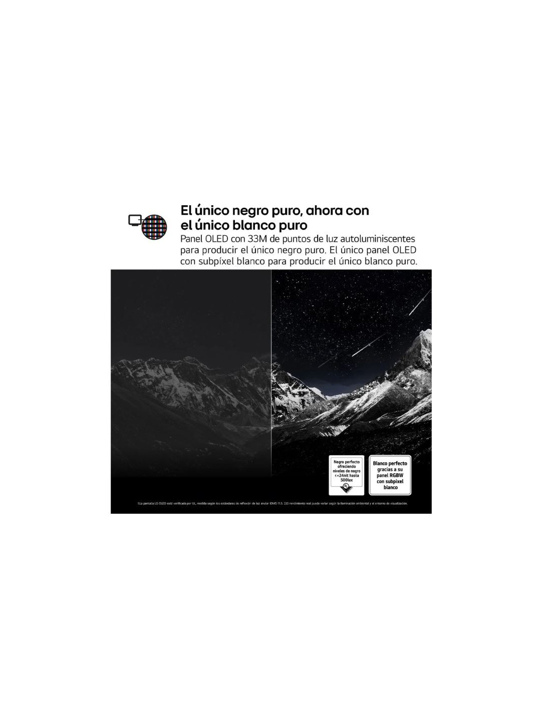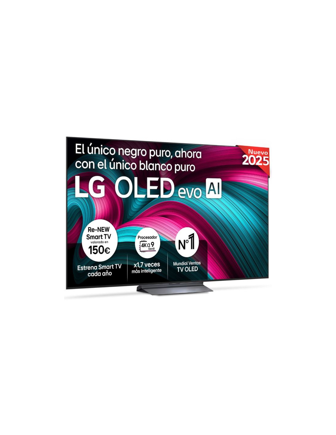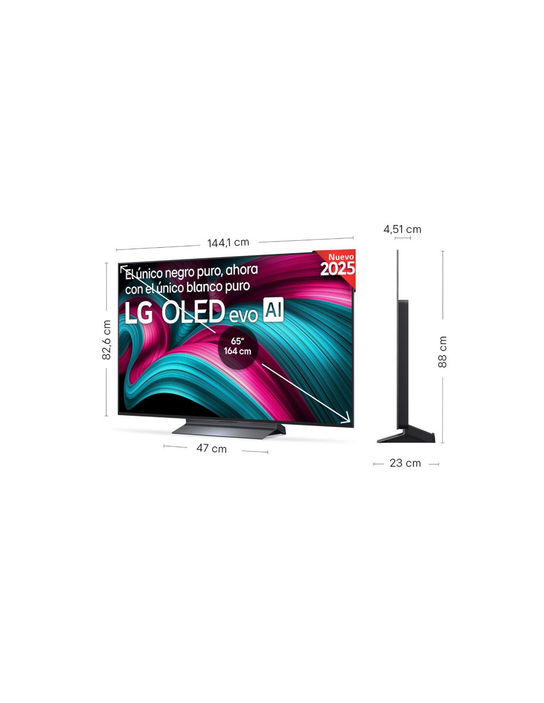 LG OLED evo AI OLED65C54LA. Diagonal de la pantalla: 165,1 cm (65"), Resolución de la pantalla: 3840 x 2160 Pixeles, Tipo HD: 4K Ultra HD, Tecnología de visualización: OLED evo, Forma de la pantalla: Plana. Smart TV. Tecnología de interpolación de movimiento: Movimiento OLED, Tiempo de respuesta: 0,1 ms, Relación de aspecto nativa: 16:9. Formato de señal digital: DVB-C, DVB-S, DVB-S2, DVB-T, DVB-T2. Wifi, Ethernet. Color del producto: Negro