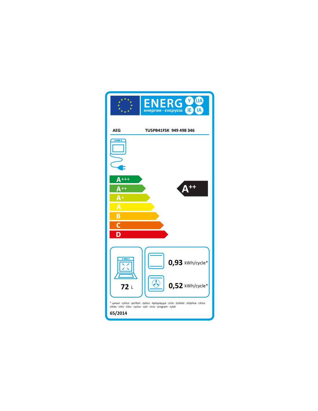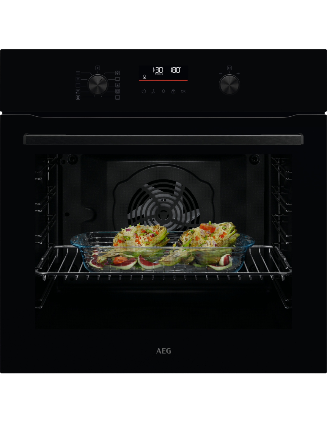 Horno MF pirolitico indep. Aeg TU5PB41FSK,Serie 5000 SurroundCook, 72L., 60cm, Limpieza Pirolitica, 9 Prog + 45 Auto prog, Display LED EXPlore con Wifi, mandos escamoteables, 3 cristales, A++, Cristal Negro y tirador Negro anodizado
