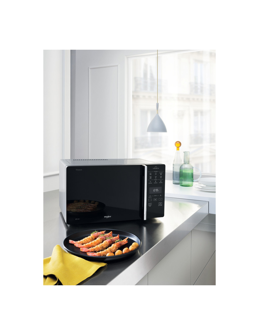 Microondas Whirlpool MCP349SL, 25L, CHEF PLUS, MWO/GRILL - 800/900W, AIRE FORZADO, CRISP, CRISP FRY, VAPOR , VAPORERA, Display: LED, 6 niveles de potencia, Sistema de distribuición de olas 3D, Apertura Lateral, Grill de Cuarzo, Jet Start, Bread Defrost, Limpieza de vapor inyectado, Temporizador, Bloqueo de seguridad, Plato Rotativo 28 cm, Color Frontal: NEGRO; Lateral: SILVER, Cavidad Pintada, 301 x 520 x 494 mm