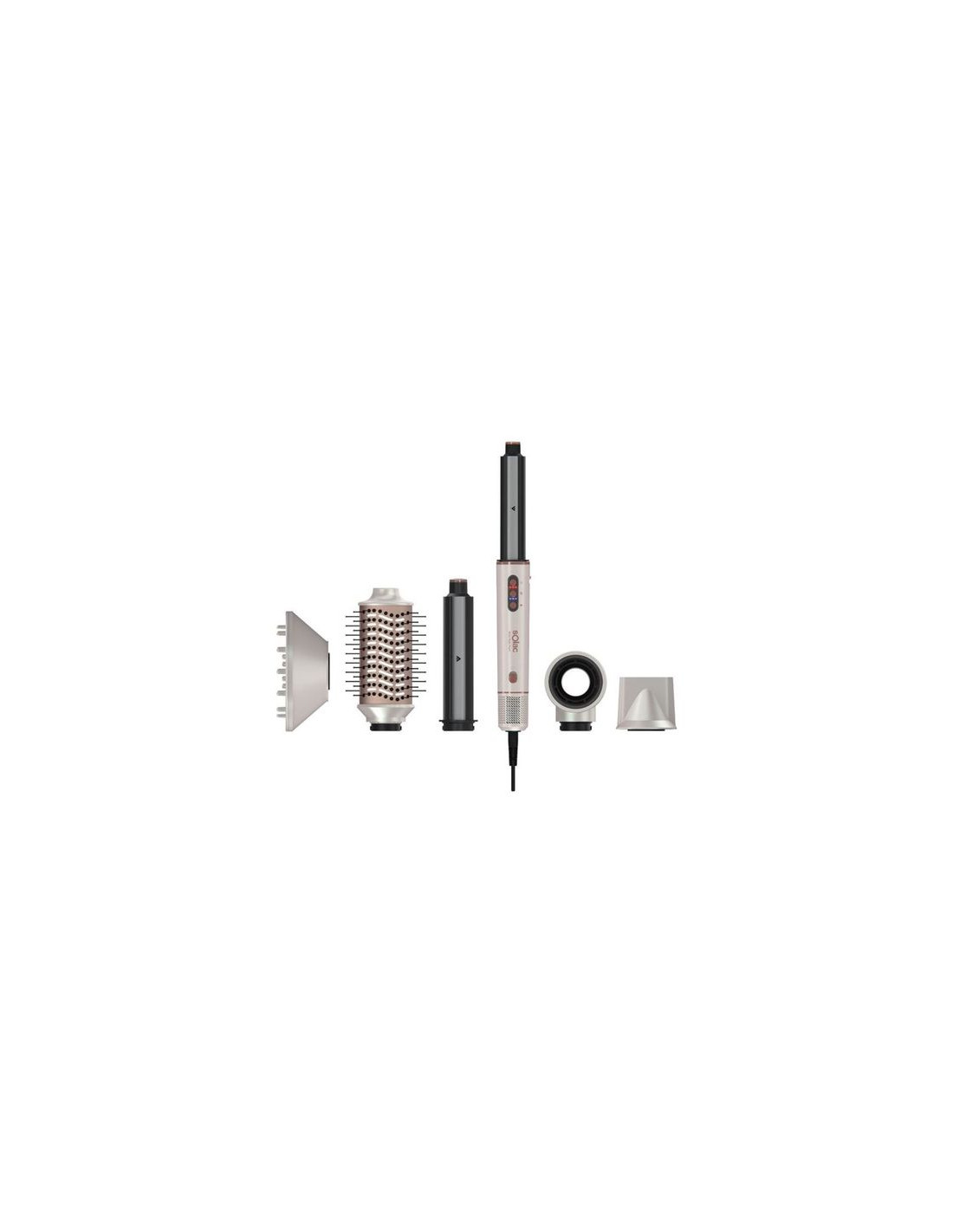 Cepillo Aire Solac TOTAL STYLE MD7406 Motor digital con 110.000 RPM Tecnología Ion-Power 6 en 1 - 6 accesorios para conseguir infinidad de estilos en un único moldeador Moldeadores automáticos izquierdo y derecho: Flujo de aire inteli gente que envuelve y atrae tu cabello para formar rizos y ondas Cepillo oval: Levanta las raíces para crear volumen y movimiento con un aspecto de ondas naturales Secador de pelo: Para el secado previo al moldeado Concentrador magnético: Concentra el flujo de aire en zonas específicas, para estilizar fijando el peinado Difusor magnético: distribuye el aire de manera uniforme, ayudando a definir rizos Control inteligente de temperatura 9 combinaciones de velocidad y temperatura Botón de aire frío para fijar el peinado Función memoria Luces indicadoras de temperatura y velocidad Compacto y ligero Tapa de filtro magnética desmontable Anilla para colgar