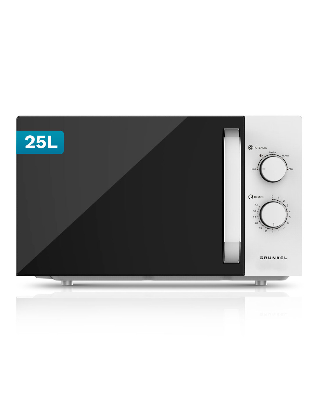 GrunkelMicroondas GRUNKEL MW25EASY, blanco, 25 LITROS. Tipo de microondas Mecánico con tirador Capacidad 25 litros Potencia 850 W Niveles de potencia 5 niveles ajustables Temporizador Hasta 35 minutos (control mecánico) Funciones Calentar, cocinar, descongelar Bandeja interior Cristal giratorio Diámetro bandeja Estándar universal (aprox. Ø245 mm) Apertura Mediante tirador Tensión 220–240 V ~ 50/60 Hz Diseño Clásico, funcional, con mandos giratorios Color Blanco y negro Material exterior Acero inoxidable Peso neto 13 kg Dimensiones (A×L×P) 29 × 48 × 38 cm Dimensiones embalado 33 × 54 × 41 cm Uso recomendado Uso diario en hogares, platos grandes y descongelación eficiente
